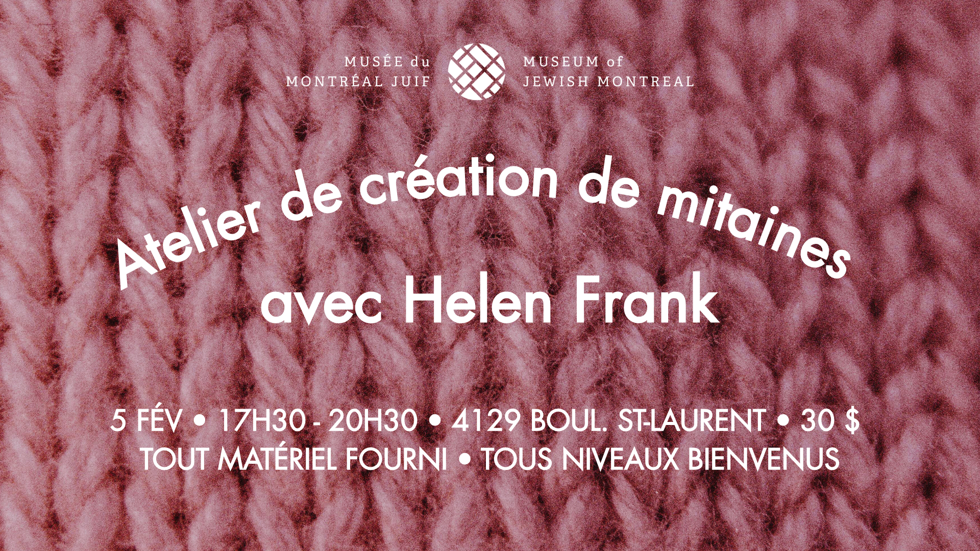 Venez upcycler des vêtements en laine et discuter avec Helen de l’histoire de l’industrie textile à Montréal et de ses liens étroits avec la communauté juive. L’atelier débutera par une brève présentation sur l’industrie du shmata (vêtement), suivie d’un enseignement sur la façon de coudre à la main une paire de mitaines à partir de chandails d’occasion. Les chandails seront fournis, ainsi qu’un patron de mitaines en trois tailles, et nous commencerons par apprendre à enfiler une aiguille. Les couturiers plus expérimentés pourront également décorer leurs mitaines avec du fil à broder, des boutons ou d’autres ornements. Aucune expérience préalable n’est requise ! Tous les niveaux sont les bienvenus.